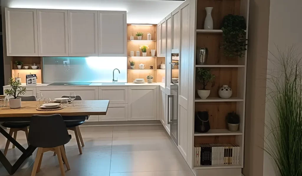 Qui serve luce viva, diffusa, diretta sulle zone operative. Faretti sotto i pensili, lampade a sospensione su isole o penisole, strisce LED integrate nei mobili. Ogni taglio di luce deve seguire il gesto, dalla preparazione alla convivialità.